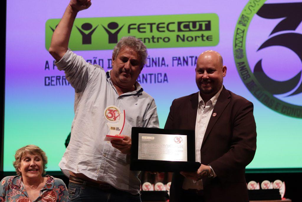 Participaram da mesa de abertura e também receberam as condecorações, o bancário Walfran dos Anjos, fundador e primeiro presidente da Federação. Ele agradeceu a todas e todos que acreditam na luta sindical como instrumento de organização da classe trabalhadora. Como conquista a primeira mulher presidenta da Fetec-CUT/CN, Leoni Philippsen, que representou os ex-presidentes da Fetec-CUT/CN, emocionada e orgulhosa testemunhou que “a luta sindical sempre foi permeada por dificuldades, mas que o desafio foi e é juntos e juntas lutarem pelo direito do coletivo”.