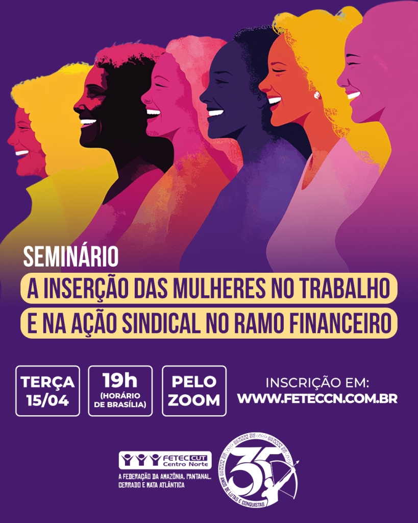 A Federação dos Trabalhadores em Empresas de Crédito do Centro-Norte (Fetec-CUT/CN) realizará na terça-feira 15 de abril, às 19h (de Brasília), seminário virtual para discutir a “A Inserção das Mulheres no Trabalho e na Ação Sindical no Ramo Financeiro” e lançar pesquisa sobre o tema com os dirigentes sindicais das entidades filiadas, com o objetivo de fortalecer a luta dos sindicatos na defesa dos direitos das mulheres.