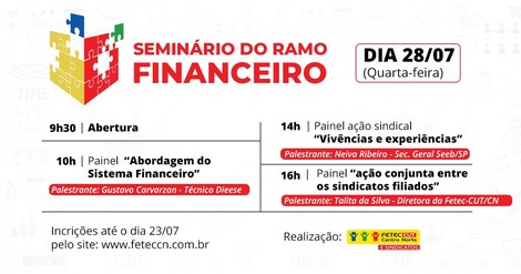 A Federação dos Bancários do Centro-Norte (Fetec-CUT/CN) realiza no dia 28 de julho, de forma virtual, o Seminário do Ramo Financeiro, voltado para todos os dirigentes dos sindicatos filiados. As inscrições podem ser feitas até esta sexta-feira 23 em https://us06web.zoom.us/webinar/register/WN_PbCB9-4HSYi3SieEA3gMjw. Após a inscrição, o participante receberá um e-mail de confirmação contendo informações sobre como entrar no webinar.