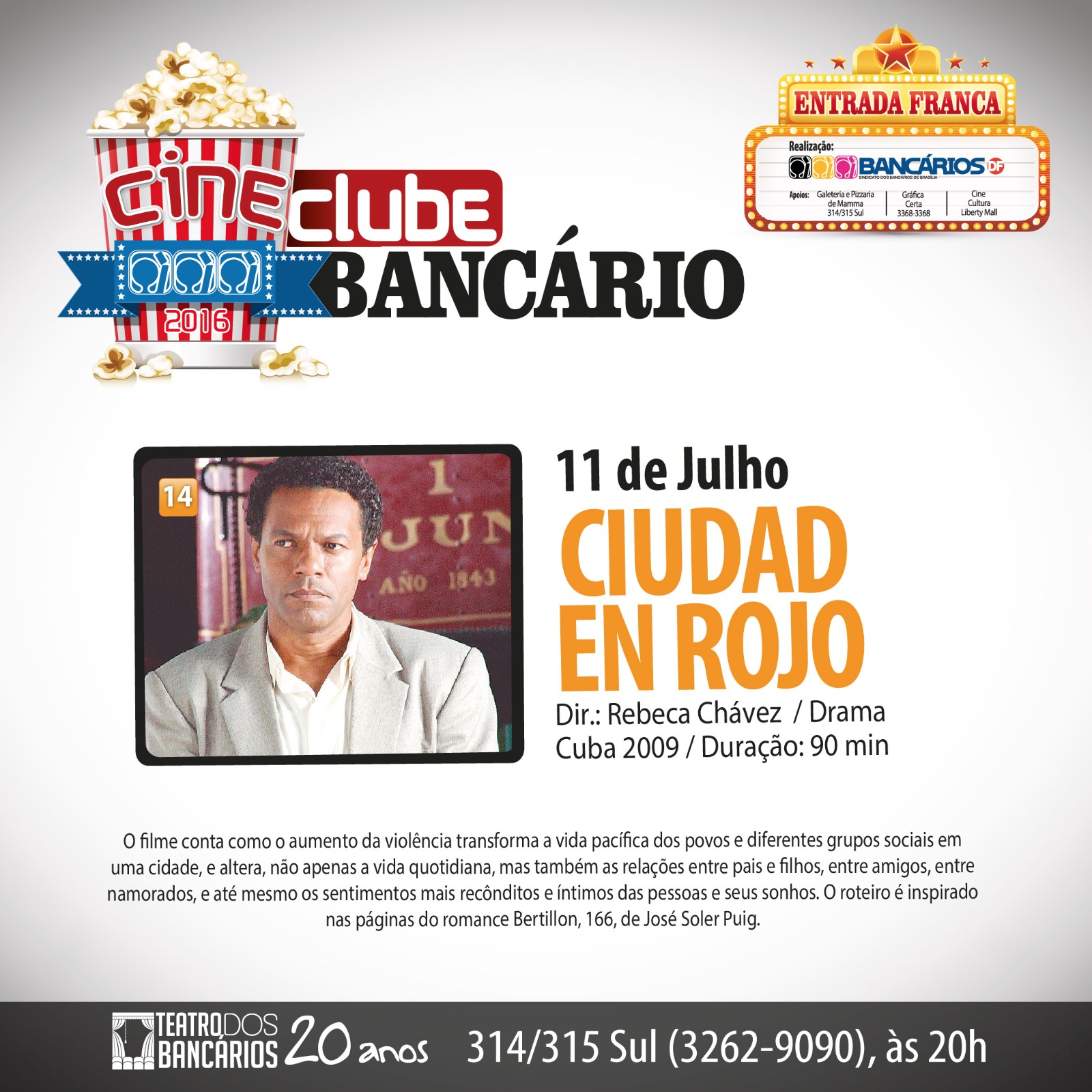 E no dia 11, o Cineclube Bancário apresenta a produção Cidade em Vermelho. Com direção de Rebeca Chávez e roteiro inspirado nas páginas do romance Bertillon, 166 de José Soler Puig, o filme conta como o aumento da violência transforma a vida pacífica dos povos e diferentes grupos sociais em uma cidade e altera, não apenas, a vida quotidiana, mas também as relações entre pais e filhos, entre amigos, entre namorados, e até mesmo os sentimentos mais recônditos e íntimos das pessoas e seus sonhos.