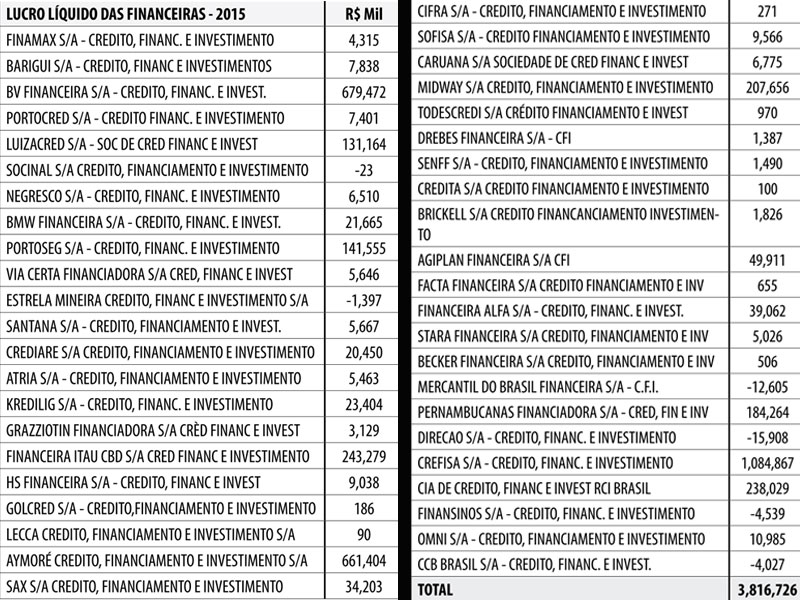 Veja o lucro líquido de 2015 de algumas financeiras