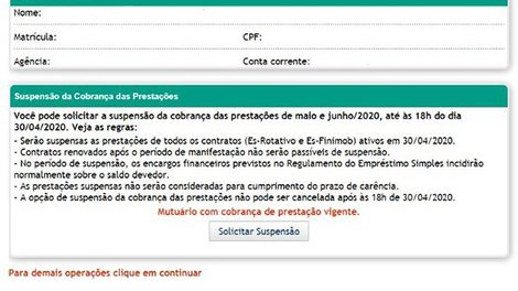 Para fazer sua solicitação, é só acessar o Autoatendimento do site opção Empréstimo Simples. A partir de 22/4 haverá uma nova tela na qual o participante pode fazer a opção ao clicar no botão “Solicitar Suspensão”. Confira na tela abaixo: