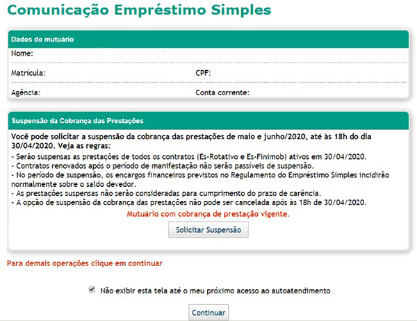 Antes de optar pela suspensão, analise se ela é realmente necessária. Lembre-se: o Empréstimo Simples foi concebido para ser liquidado em um prazo determinado na sua contratação. Logo, quando ocorre a interrupção do pagamento de prestações, o saldo fica desequilibrado, já que continua a ser corrigido sem que haja amortização de prestação, podendo gerar um resíduo ao final do contrato que será refinanciado em até seis meses.