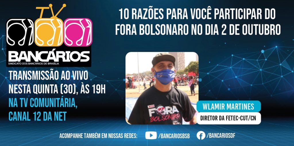 O TV Bancários desta quinta-feira (30) tem como tema Fora Bolsonaro no dia 2 de outubro: 10 razões para você participar. O convidado do programa é Wlamir Ubeda Martines, diretor da Federação Centro Norte (Fetec-CUT/CN), que acompanha no DF as ações de mobilização da Campanha Nacional Fora Bolsonaro, coordenada pela CUT, demais centrais sindicais e frentes Brasil Popular e Povo sem Medo.