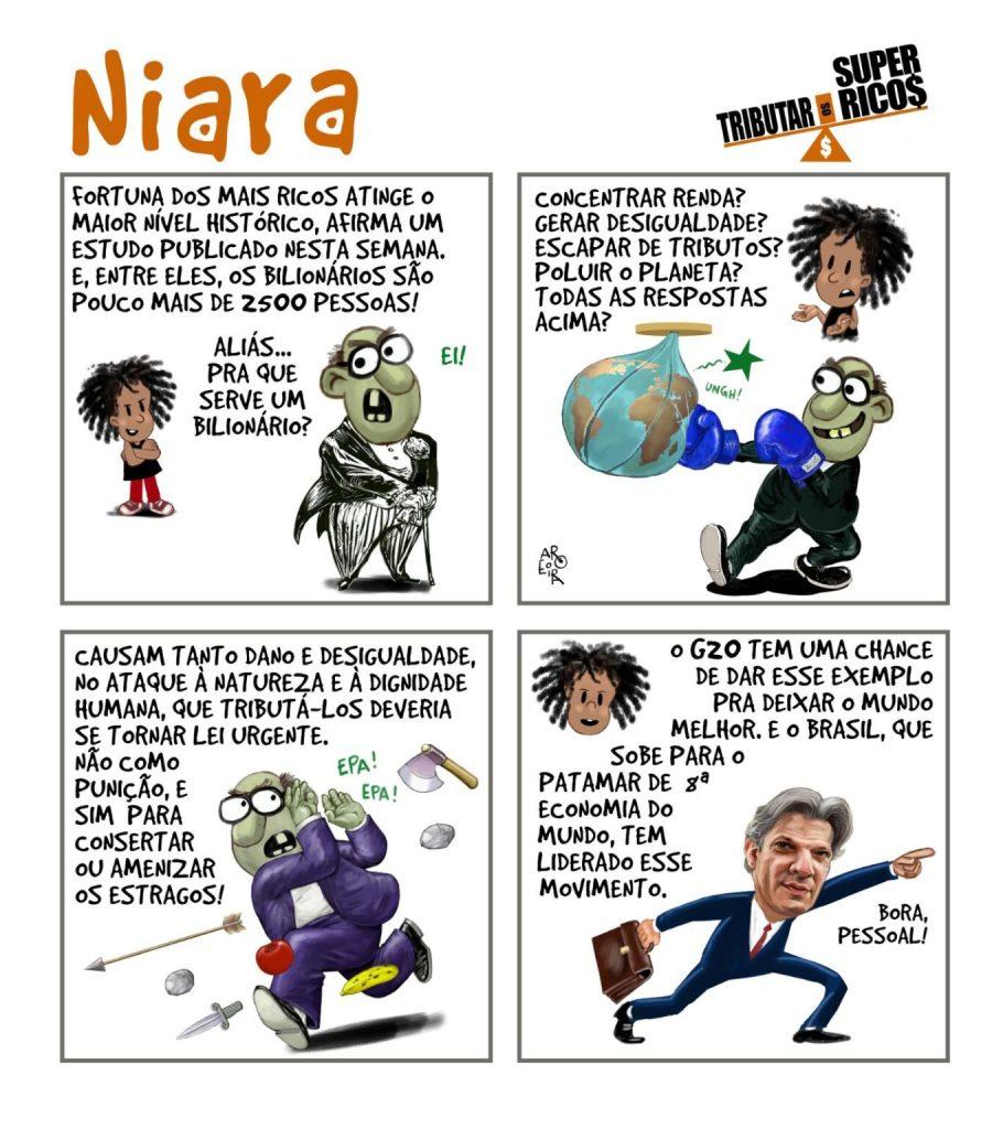 Assim, as mais de 70 organizações sociais, entidades e sindicatos que compõem a Campanha dizem que o G20 tem a chance de entrar para a história ao endossar e implementar a proposta brasileira pela taxação global dos super-ricos. Não se trata, porém, de “punir” os bilionários pelas suas fortunas, mas “consertar” ou “amenizar” os estragos produzidos por eles. “Tributar os bilionários deixa o mundo menos desigual… E mais justo!”.