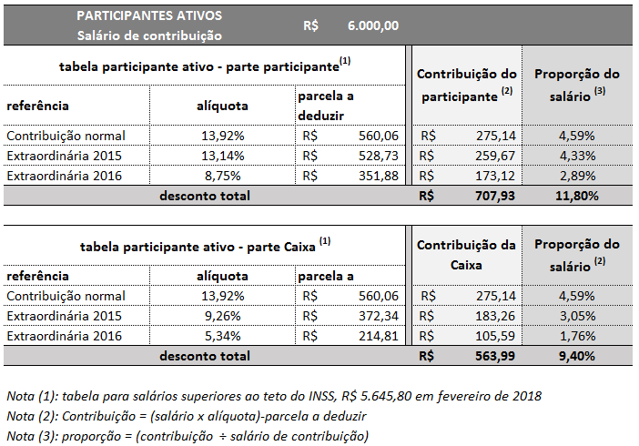 Para os ativos com salário de R$ 6 mil, o desconto somando a contribuição normal e a extraordinária de 2015 ficará em aproximadamente R$ 534,81 ou cerca de 9% do rendimento. Somando mais o equacionamento de 2016, o desconto total subirá para R$ 707,93 ou 11,8% do rendimento mensal. Enquanto isso, à Caixa caberá pagar R$ 563,99, o que equivale a 9,4%.