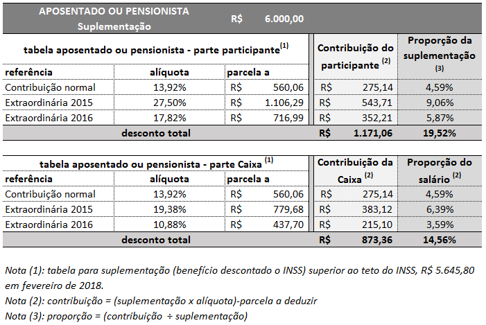 Com a soma dos valores finais da contribuição normal e da contribuição extraordinária referente a 2015, aposentados e pensionistas com suplementação de R$ 6 mil, por exemplo, terão desconto total aproximado de 13,65% ou R$ 818,88. Com o equacionamento de 2016, que aguarda aprovação da SEST e tem implementação prevista para este mês, o desconto total subirá para R$ 1.171,06 ou 19,52% do rendimento mensal, quase quatro vezes mais na comparação com a contribuição normal, que é de 4,59%. Juntando os dois equacionamentos, a Caixa pagará ao mês R$ 534,81 ou cerca de 9% do rendimento do participante. Com o equacionamento de 2016, o desconto total subirá para R$ 707,93 ou 11,8% do rendimento mensal, mais que o dobro na comparação com a contribuição normal, que é de 4,59%.