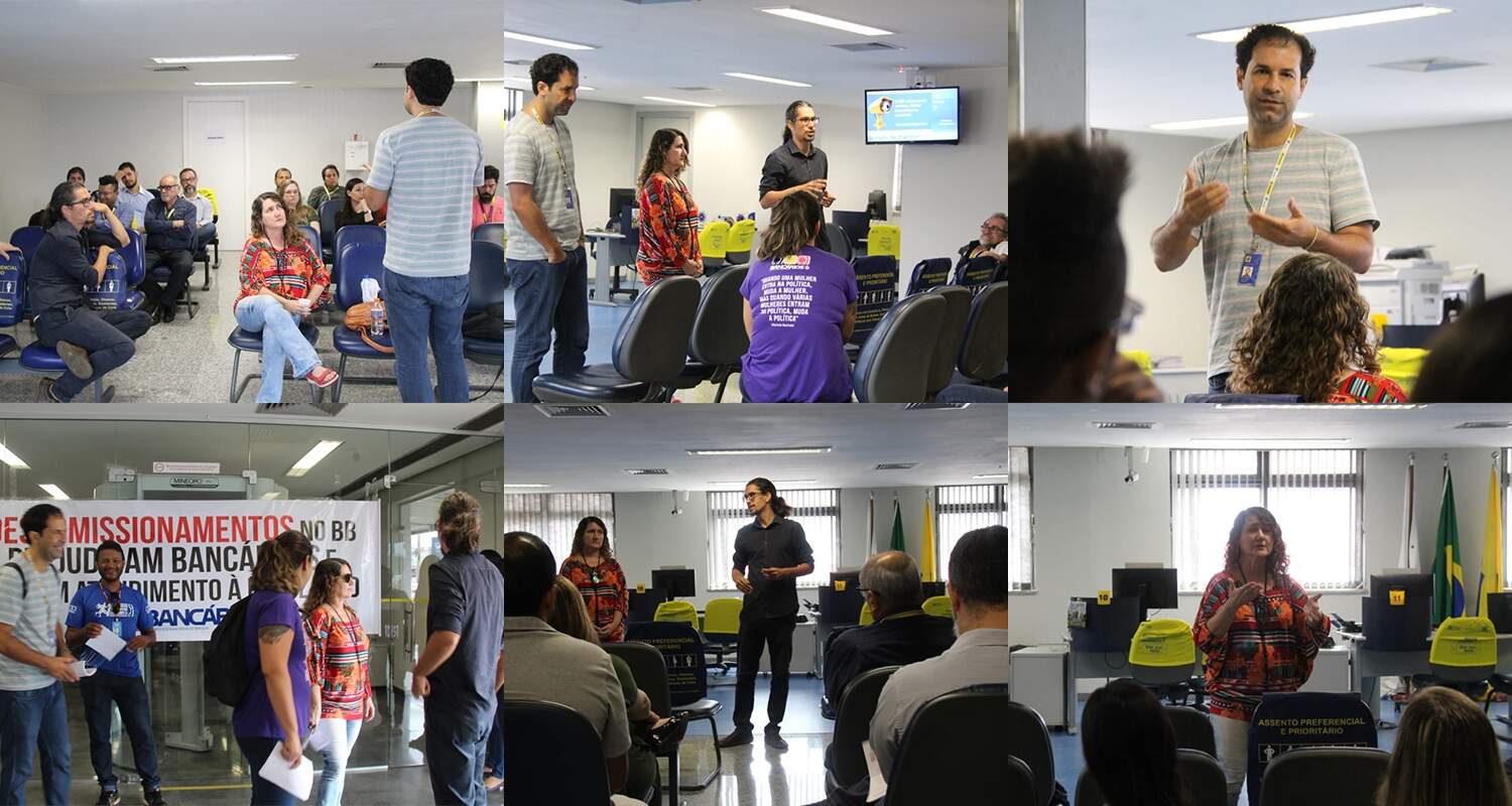Em protesto contra o descomissionamento arbitrário de funcionários do Banco do Brasil, bancários e bancárias paralisaram os trabalhos na agência do banco da Praça do Relógio, em Taguatinga, durante toda a manhã desta quarta-feira (13).