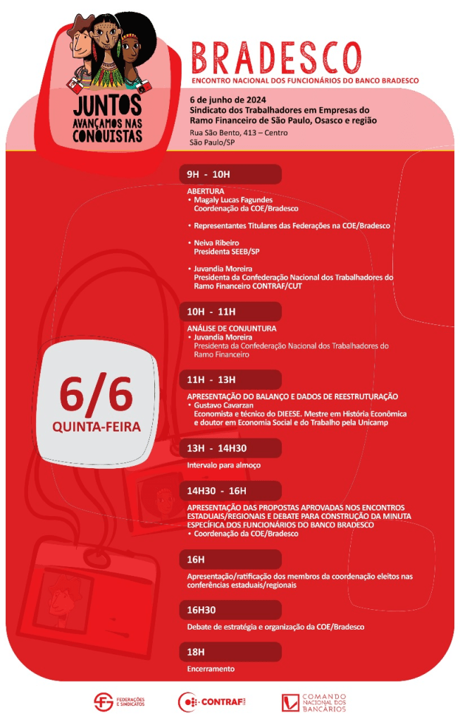 Os bancários do Bradesco realizam seu encontro nacional, nesta quinta-feira (6), na sede do Sindicato dos Bancários de São Paulo, na capital paulista. Os debates do dia serão convergidos na minuta específica dos trabalhadores, entregue ao Bradesco posteriormente.