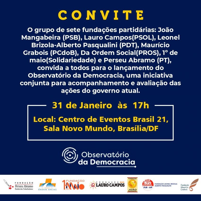 Com a finalidade de monitorar e avaliar as políticas governamentais da gestão de extrema direita de Jair Bolsonaro, instituições ligadas aos partidos do campo progressista lançam nesta quinta (31), em Brasília, o Observatório da Democracia. O ato acontece no centro de eventos Brasil 21, às 17h.
