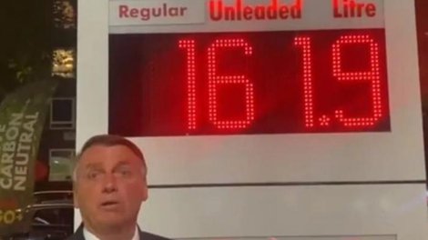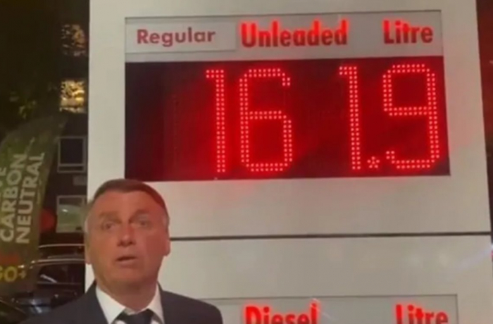 Em frente a um posto, o presidente afirma que o preço da gasolina na capital inglesa – 1,61 libra (equivalente a R$ 9,70) – é “praticamente o dobro da média de muitos estados do Brasil”. Bolsonaro disse, ainda, que a gasolina brasileira é “uma das mais baratas do mundo”.