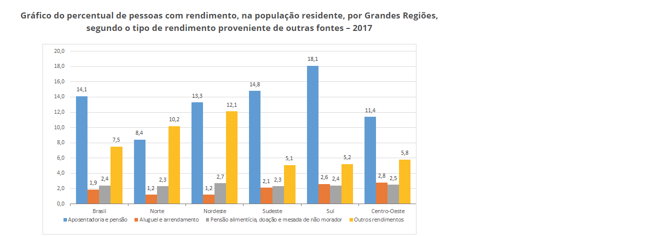 Nas demais regiões, a categoria aposentadoria ou pensão foi a que registrou os maiores percentuais, com destaque para o Sul, que tinha 18,1% da população residente com esse tipo de rendimento, contra 17,3% em 2016.