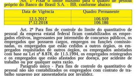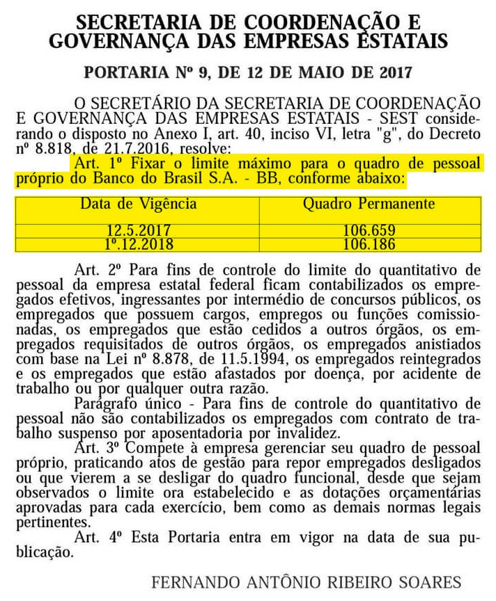 E mais: por meio da Portaria nº 9, de 12 de maio de 2017 (imagem acima), a Secretaria de Coordenação e Governança das Empresas Estatais (Sest) fixa o limite máximo para o quadro de pessoal próprio do BB para 106.786 funcionários até 1º de dezembro de 2018.