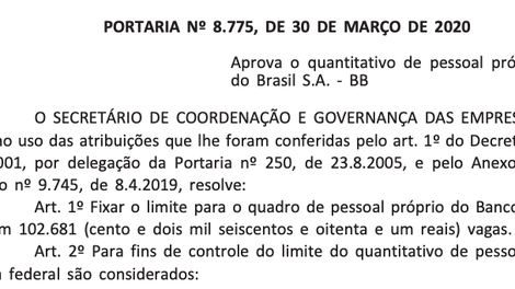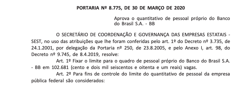 A Secretaria de Coordenação e Governança das Empresas Estatais (Sest) fixou o quantitativo do quadro de pessoal próprio do Banco do Brasil em 102.681 funcionários. A portaria foi publicada nesta terça-feira (31) no Diário Oficial da União (imagem acima). A medida envolve empregados efetivos, cedidos ou disponibilizados para outros órgãos, comissionados e temporários, entre outros.