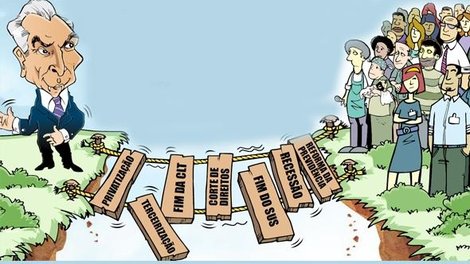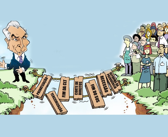 Temer vai colocar em prática o que está prescrito em A Ponte para o Futuro e A Travessia Social, programa de governo do PMDB que nada mais é do que uma reedição da cartilha neoliberal que afundou o Brasil na década de 90 sob FHC, com o fim de direitos trabalhistas e previdenciários, privatizações e a redução de programas sociais.