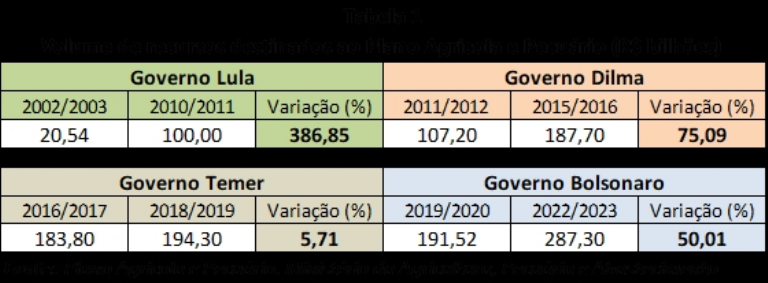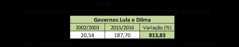 Considerando os Governos Lula e Dilma, o volume de recursos destinados à Agricultura Empresarial teve um salto de 813,83%, passando de R$ 20,54 bilhões no Plano Safra 2002/2003 para R$ 187,70 bilhões no Plano Safra 2015/2016, conforme pode ser verificado na Tabela 2 abaixo.
