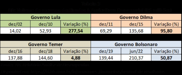 Entre 2003 e 2015, a estratégia de atuação do Banco do Brasil foi ajustada para refletir a nova realidade econômico-social e política do país. Entre outros posicionamentos, o Banco advogava “ser um banco competitivo e rentável, promover o desenvolvimento sustentável do Brasil e cumprir sua função pública com eficiência”. A materialização da estratégia era reforçada nos objetivos estratégicos que, entre outros, proclamava a necessidade de “reforçar o papel de parceiro fundamental para o desenvolvimento sustentável do País, com ênfase no apoio às atividades geradoras de trabalho e renda, em especial aquelas relacionadas ao agronegócio”. Em consonância com a nova estratégia corporativa, o volume de recursos destinados pelo Banco do Brasil à Agricultura Empresarial passou de R$ 14,02 milhões em dezembro de 2002 para R$ 52.931 milhões em dezembro de 2010 (crescimento de 277,54%). No Governo Dilma, o volume de recursos cresceu 95,80%. No Governo Temer, 4,88% e no Governo Bolsonaro, 50,87%, conforme demonstrado na Tabela 3 abaixo