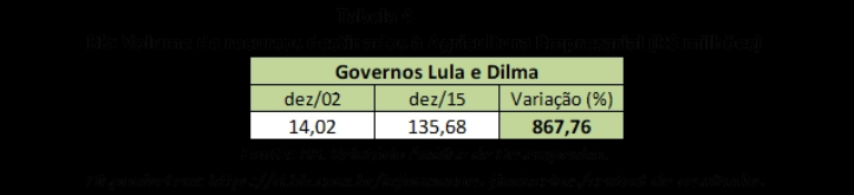 Considerando os Governos Lula e Dilma, o volume de recursos destinados pelo Banco do Brasil à Agricultura Empresarial teve um salto de 867,46%, passando de R$ 14,02 milhões (2002) para R$ 135.677 milhões em 2015, conforme Tabela 4 abaixo.