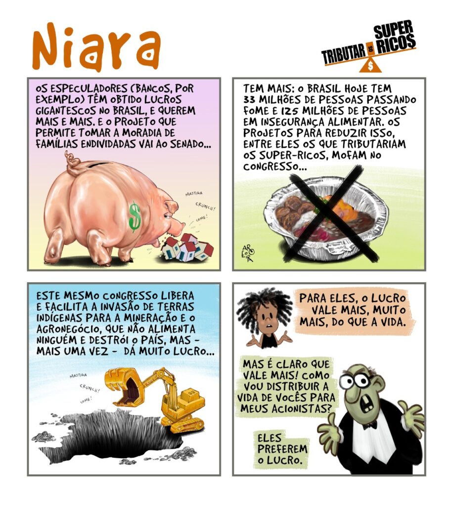 “Esse mesmo Congresso libera e facilita a invasão de terras indígenas para mineração e o agronegócio”, denuncia Niara, a mascote da campanha Tributar os Super-Ricos.
