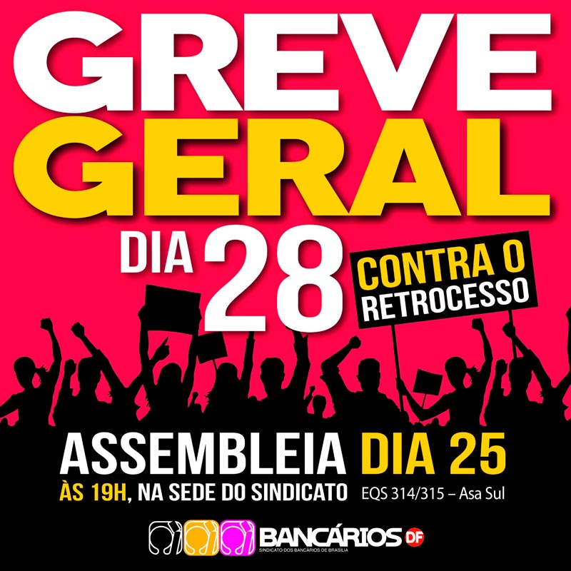 “A participação dos bancários nessa grande greve que será o dia 28 foi uma decisão da diretoria executiva do Sindicato, atenta a esse cenário político de fortes ameaças à categoria”, explica Eduardo Araújo. “Organizaremos o movimento em assembleia marcada para o dia 25, que será precedida por uma plenária e por uma reunião de delegados sindicais, onde nossa pauta e estratégia serão tratadas”.