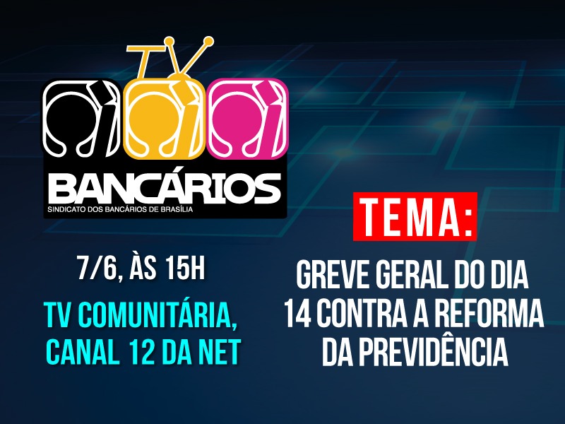 Na edição desta sexta-feira (7), o TV Bancários na TV Comunitária apresenta como as categorias do DF estão se organizando para a Greve Geral de 14 de junho, convocada pelas centrais sindicais. A transmissão do programa será ao vivo, a partir das 15h, pela página do Sindicato no Facebook e pelo canal 12 da Net.