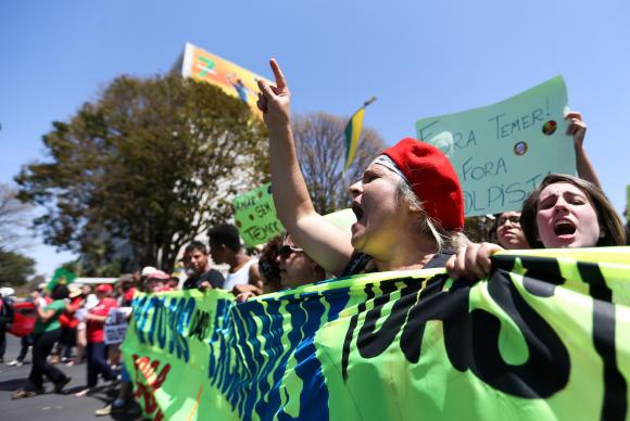 Do lado oposto ao do desfile oficial, manifestantes pedem saída de Temer