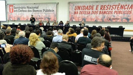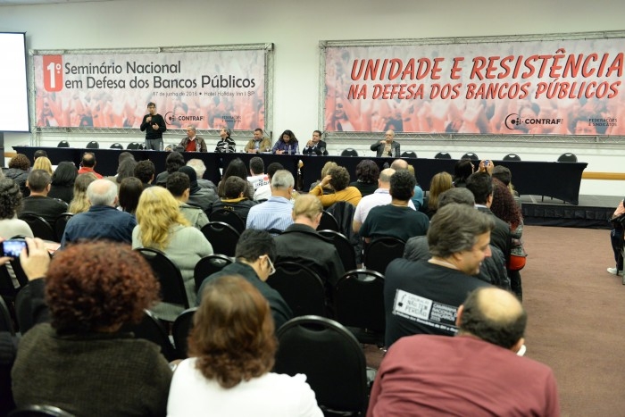 “Os bancos públicos: ativo necessário na sociedade brasileira” foi o tema da primeira mesa de debates do 1º Seminário Nacional em Defesa dos Bancos Públicos, realizado pela Contraf/CUT, em preparação à Campanha Nacional dos Bancários 2016. O evento foi aberto na manhã desta sexta-feira (17), no Hotel Holiday Inn – Parque Anhembi, em São Paulo, e faz parte da programação dos encontros específicos dos bancários da Caixa e do Banco do Brasil, que vai até domingo (19). Um dos objetivos é sugerir aos participantes do 32º Conecef e do 27º Congresso Nacional dos Funcionários do BB uma reflexão mais aprofundada sobre o papel, a importância e as ameaças que os bancos públicos estão enfrentando em momento de retorno da agenda neoliberal, por intermédio do governo golpista e ilegítimo de Michel Temer.