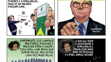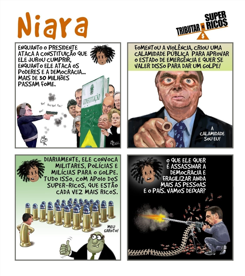 Niara, a mascote da campanha Tributar os Super-Ricos, lembra que, enquanto o atual presidente da República ataca os poderes e as democracia, mais de 30 milhões de brasileiros passam fome. “Ele convoca o golpe com o apoio dos super-ricos, que estão cada vez mais ricos”, denuncia a personagem.