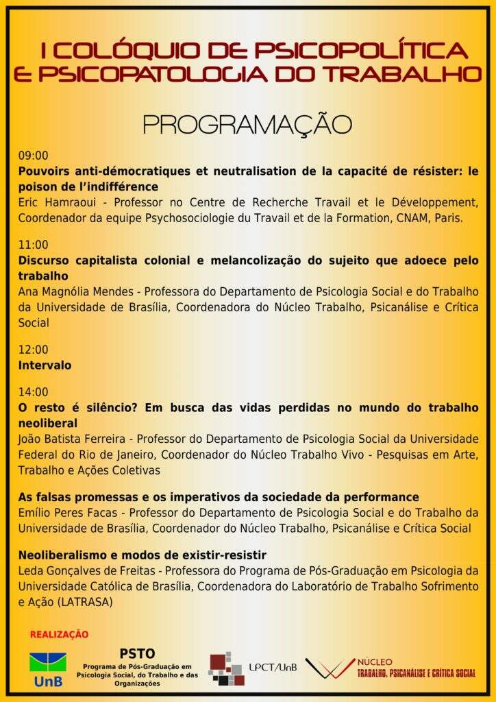 O Sindicato convida as bancárias e os bancários a participarem do I Colóquio de Psicopolítica e Psicopatologia do Trabalho, promovido pelo Programa de Pós-Graduação em Psicologia Social, do Trabalho e das Organizações da UnB, na sexta-feira (20), das 9h às 17h30, no Campus Darcy Ribeiro e no Instituto de Biologia (auditório I). O evento é gratuito e as vagas são limitadas.