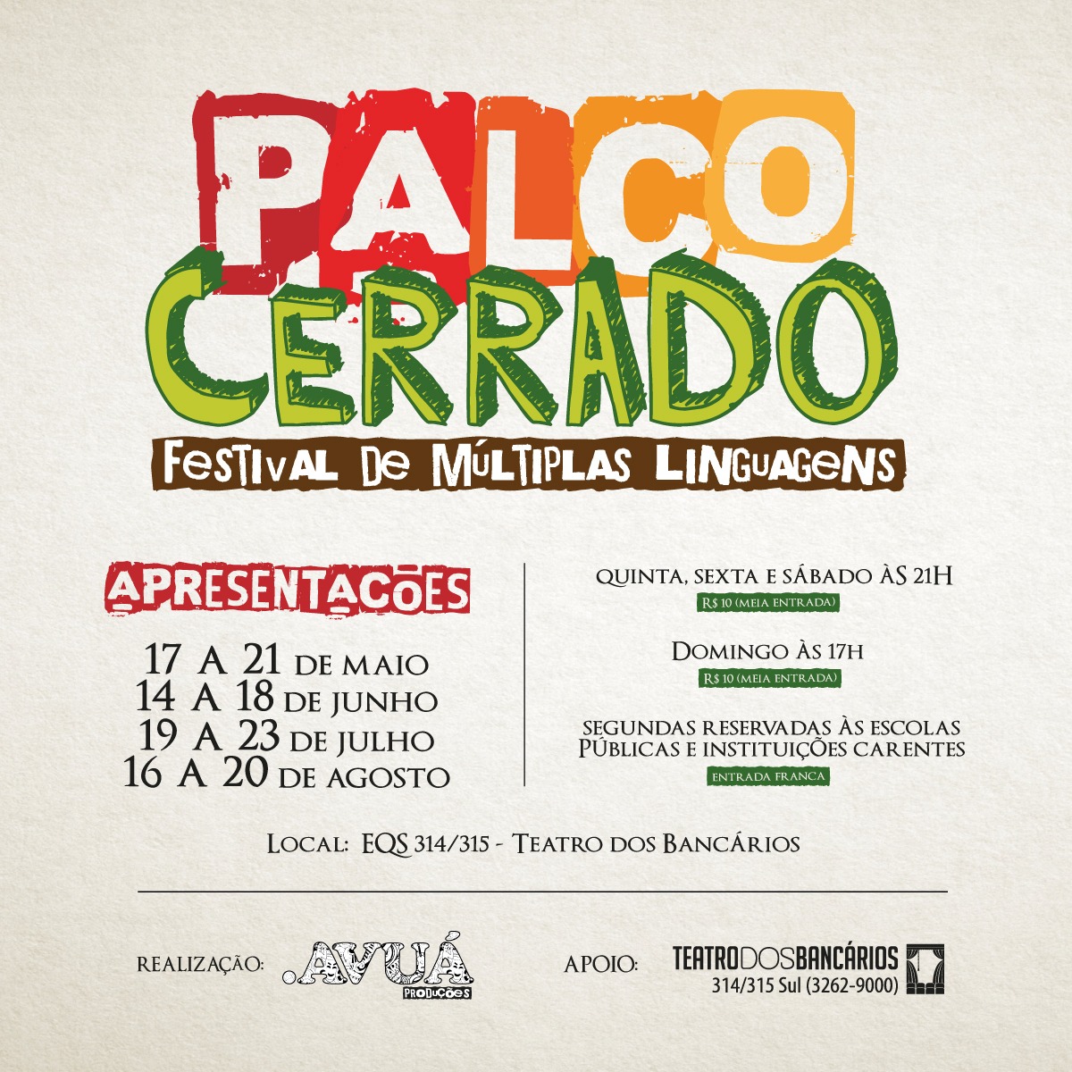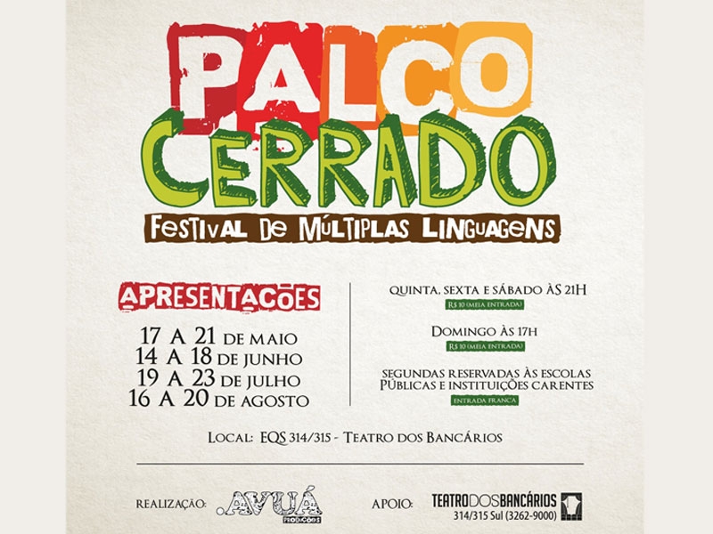 Mais de 120 projetos estão na disputa para o 1º Palco Cerrado – Festival de Múltiplas Linguagens, cujas inscrições foram encerradas na sexta-feira (16). A Avuá Produções, juntamente com o Teatro dos Bancários, agradece o número expressivo de interessados em mostrar o seu trabalho, o que comprova a importância de um evento como esse, assim como a dimensão da produção cultural do DF.