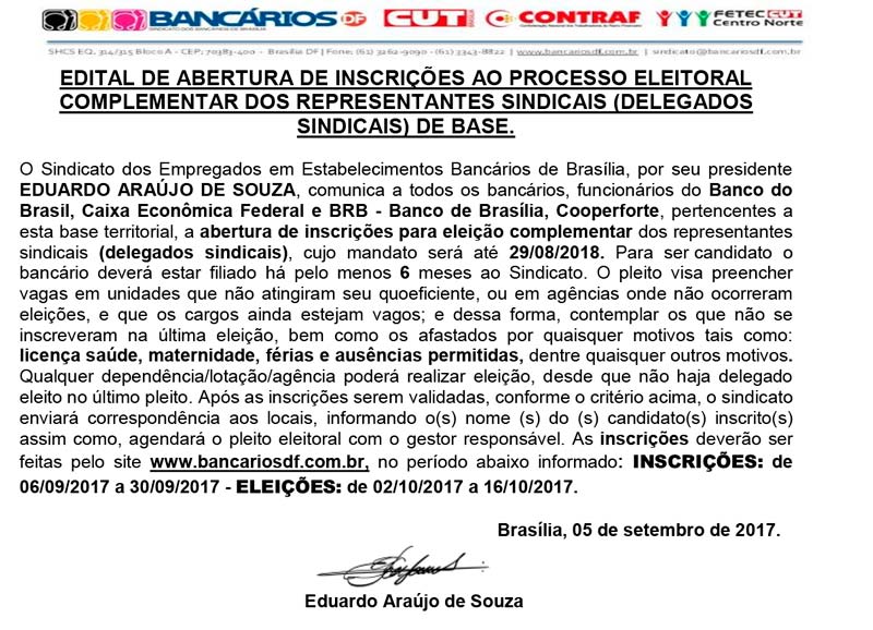 O Sindicato abre a partir desta quarta-feira (6) as inscrições para a eleição complementar que escolherá delegados e delegadas sindicais do Banco do Brasil, da Caixa, do BRB, da Cooperforte, da Poupex, do Banrisul e do BNDES nos locais onde o quoeficiente não foi atingido ou onde não ocorreram eleições e que o cargo ainda esteja vago. O prazo de inscrição se encerra no dia 30 de setembro.