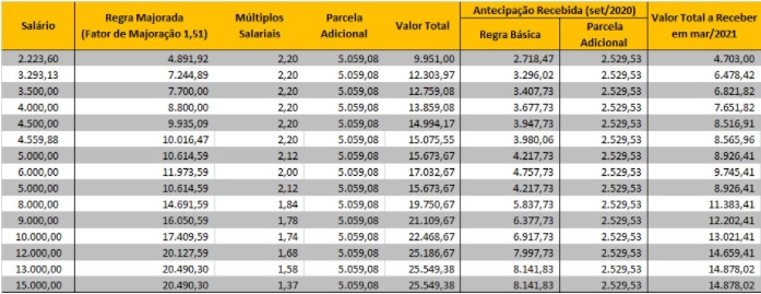 Devido à queda no lucro, o Itaú não pagará 2,2 salários para todos, com teto de R$ 20.528,66. Neste ano, o banco adotou a regra de 5% do lucro para pagar, que corresponde a regra básica de 90% do salário de dezembro de 2020 + valor fixo de R$ 2.529,54, limitado a R$ 13.568, 74, que deverá ser multiplicado por 1,512826. Com isso, vai haver majoração no pagamento, conforme a tabela abaixo. O valor da parcela adicional é de R$ 5.059,08, que será paga no mesmo dia.