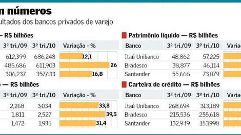 No conjunto, os três maiores bancos privados do país lucraram R$ 7,496 bilhões no terceiro trimestre de 2010. Somados, os ativos totais atingiram R$ 1,656 trilhão. Além da expansão do crédito, contribuiu para os resultados a manutenção da tendência de queda das despesas com provisões para devedores, que nos 12 meses encerrados em setembro encolheram 29,4%.