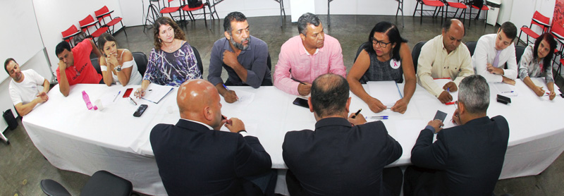 Participaram da reunião Edmilson Lacerda, Robertinho Alves e Sandro Oliveira (diretores do Sindicato), e Conceição Costa, Washington Henrique e Louraci Morais (diretores da Fetec-CUT/CN), todos funcionários do Itaú. A secretária de Saúde do Sindicato, Mônica Dieb, e o presidente, Eduardo Araújo, também participaram do encontro.