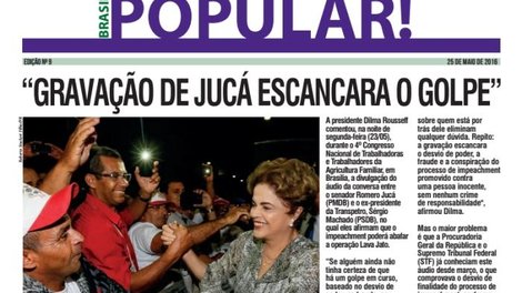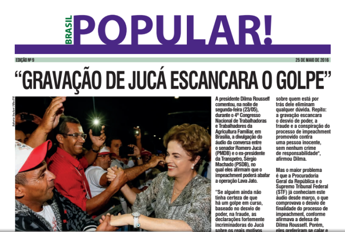 Com a manchete “Gravacão de Jucá escancara o golpe”, acaba de sair a nova edição do jornal Brasil Popular. A publicação, iniciativa de uma cooperativa de jornalistas e militantes de movimentos sindicais e sociais, informa e discute as medidas e o projeto do novo governo golpista de Temer e traz reportagens sobre a resistência das forças populares à ruptura democrática e ao retrocesso em direitos e conquistas sociais. Acesse aqui a versão em pdf (BrasilPopular__09_web ). A edição impressa será distribuída gratuitamente às 16h na Rodoviária do plano.