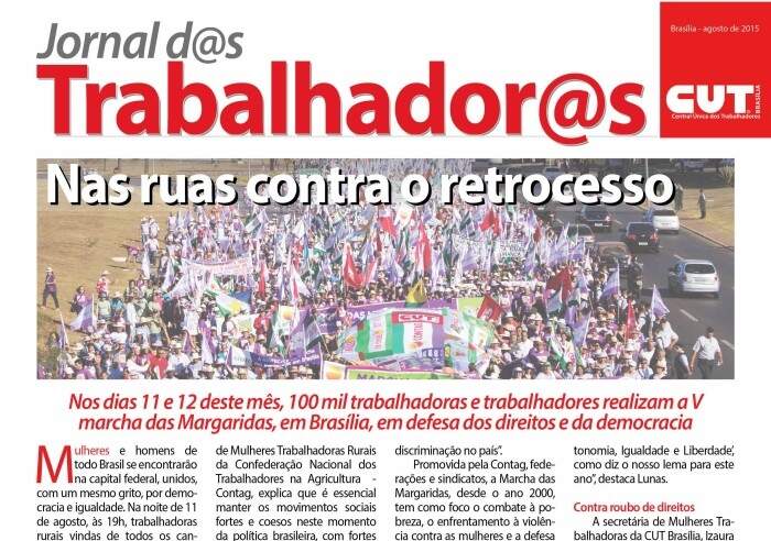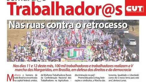 A nova edição do Jorn@al do Trabalhador@s, produzido pela CUT Brasília, traz a matéria principal com a manchete Nas ruas contra o retrocesso, na qual convoca todas as trabalhadoras e os trabalhadores para participarem da Marcha das Margaridas, no próximo dia 12, em Brasília. São esperados cerca de 100 mil trabalhadores do campo e da cidade nesta V Marcha, que saírá às 7h do Mané Garrincha e seguirá até a praça dos Três Poderes, em defesa da democracia e da igualdade de direitos.