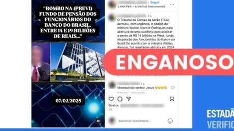 "O Estadão Verifica investigou e concluiu que: é enganoso. Na realidade, a Previ registrou superávit de R$ 4,7 bilhões em 2022, final do mandato de Bolsonaro. O dado mais recente, divulgado durante a gestão de Lula, de novembro de 2024, mostra que o superávit agora é de R$ 528 milhões", observou o noticiário.