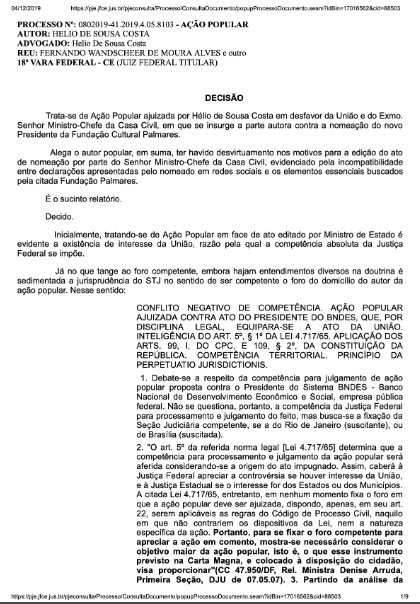 A Ação Popular contra a nomeação de Camargo foi ajuizada por Helio Sousa Costa. “A nomeação […] contraria frontalmente os motivos determinantes para a criação daquela instituição e a põe em sério risco, uma vez que é possível supor que a nova presidência, diante dos pensamentos expostos nas redes sociais pelo gestor nomeado, possa atuar em perene rota de colisão com os princípios constitucionais da equidade, da valorização do negro e da proteção da cultura afro-brasileira”, escreveu o juiz em sua decisão.