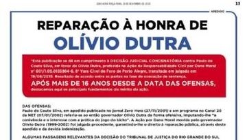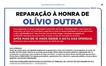 Sul21 – O jornal Zero Hora publicou, nesta terça-feira (20), uma página inteira em reparação à honra do ex-governador Olívio Dutra (PT), por um texto de 16 anos atrás, que constava na sessão ‘Apedido’, escrito pelo advogado Paulo de Couto Silva. Na publicação, o advogado acusava Olívio de “conivência e interesse com a prática do jogo do bicho”, além de chamá-lo de “um dos maiores mentirosos que já passaram pelo Estado do Rio Grande do Sul”.