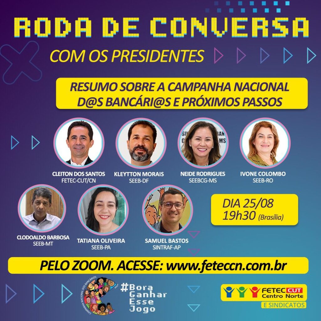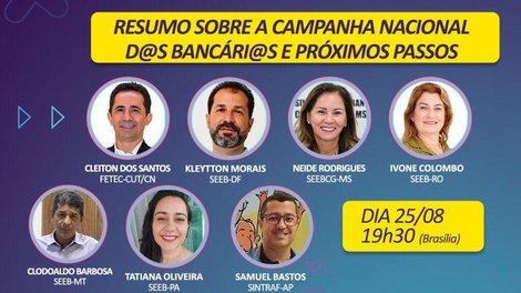 Os representantes das bancárias e dos bancários debaterão a Campanha Nacional 2022. Participarão também o presidente da Fetec-CUT/CN, Cleiton dos Santos, as presidentas do sindicatos de Mato Grosso do Sul, Neide Rodrigues; de Rondônia, Ivone Colombo; e do Pará, Tatiana Oliveira; e ainda Clodoaldo Barbosa e Samuel Bastos, presidentes dos sindicatos do Mato Grosso e do Amapá, respectivamente.