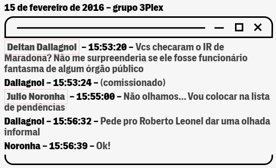 Em 15 de fevereiro daquele 2016, Dallagnol sugeriu aos colegas no grupo 3Plex que pesquisassem as declarações anuais de imposto de renda do caseiro Elcio Pereira Vieira, conhecido como Maradona. “Vcs checaram o IR de Maradona? Não me surpreenderia se ele fosse funcionário fantasma de algum órgão público (comissionado)”, disse. “Pede pro Roberto Leonel dar uma olhada informal”.