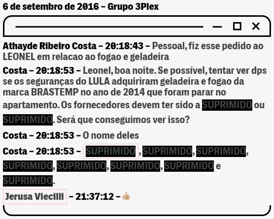 Em 6 de setembro de 2016, o procurador Athayde Ribeiro Costa informou aos colegas no grupo 3Plex que pediu a Leonel para averiguar se os seguranças de Lula tinham adquirido uma geladeira e um fogão, dois anos antes, para equipar o triplex que a empreiteira OAS diz ter reformado para o petista no Guarujá. Costa enviou ao auditor sem autorização judicial, os nomes de oito seguranças que trabalhavam para o ex-presidente, além do nome de duas lojas. Não há confirmação, nos chats, se Leonel verificou as informações, mas no processo do triplex, que levou Lula à prisão, a OAS é indicada como responsável pela compra dos eletrodomésticos, e não os seguranças.