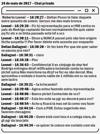 Dallagnol quis saber de Leonel por que o chefe do auditor suspeitava que ele poderia ter repassado informações sobre os pais de Loures à força-tarefa. O auditor deixou a pergunta sem resposta, mas contou que iria protocolar nova representação. “Confidencial”, escreveu. “A ex cônjuge do dep fed Rodrigo entregou dirpfretificadora incluindo conta no banco pictet suica Não menciona na dirpf se fez ou não dercat. Mas aproveitou o embalo e inseriu saldo de 1 milhão em ccna suica aem lastro”.