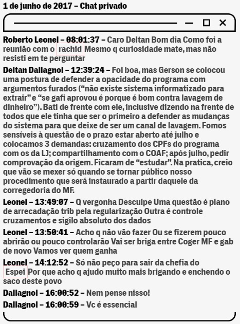 Dallagnol chegou a tratar do assunto em junho de 2017 com o então secretário da Receita Federal, Jorge Rachid, e também com Gerson Schaan, o chefe de Leonel, numa reunião da qual participaram outros integrantes da força-tarefa. Dallagnol relatou o encontro ao auditor amigo, que não estava presente. “Bati de frente com ele, inclusive dizendo na frente de todos que ele tinha que ser o primeiro a defender as mudanças do sistema para que deixe de ser um canal de lavagem.”