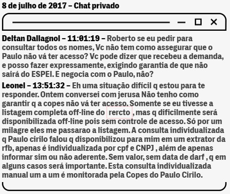 Um mês depois desse diálogo, os dois continuavam insatisfeitos com a falta de acesso às informações do programa, e Dallagnol consultou Leonel sobre a possibilidade de buscá-las nos computadores da Receita sem que a cúpula do órgão fosse alertada. “Se eu pedir para consultar todos os nomes, Vc não tem como assegurar que o Paulo não vá ter acesso?”, escreveu Dallagnol ao auditor. “Vc pode dizer que recebeu a demanda, e posso fazer expressamente, exigindo garantia de que não sairá do ESPEI. E negocia com o Paulo, não?”