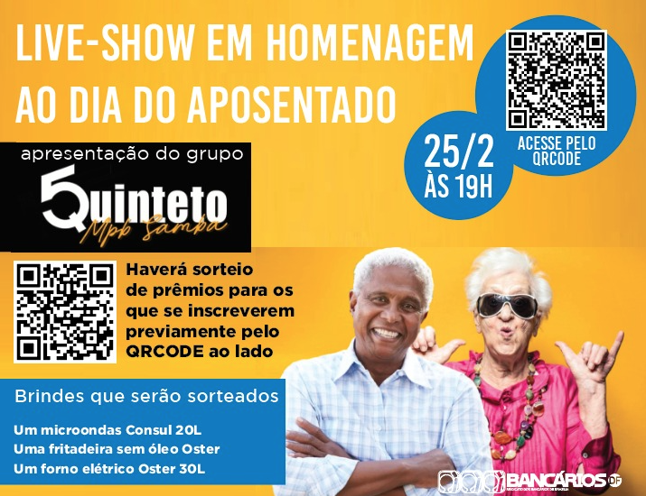 Para participar dos sorteios basta se inscrever previamente pelo link http://app.bancariosdf.com.br/live_aposentados/.