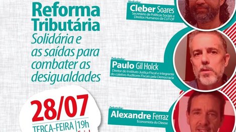 Participarão do debate o secretário de Políticas Sociais e Direitos Humanos da CUT-DF, Cleber Soares; o diretor do Instituto de Justiça Fiscal e integrante do Coletivo Auditores Fiscais Pela Democracia, Paulo Gil Holck; e o economista do Departamento Intersindical de Estatística e Estudos Socioeconômicos (Dieese), Alexandre Ferraz.