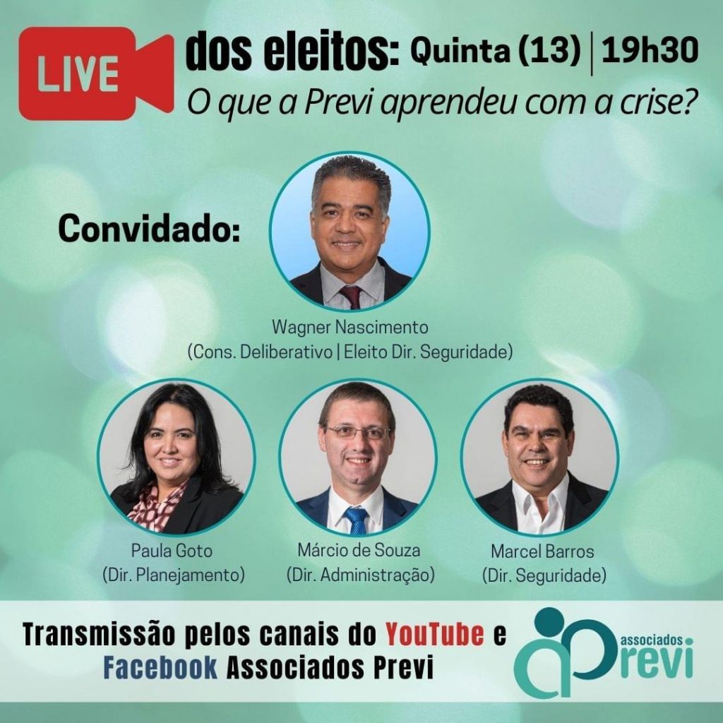 O que a Previ aprendeu com a crise? Esse e outros temas, como a recuperação dos investimentos do Plano 1 e do Previ Futuro, serão debatidos pelos diretores eleitos com os associados na próxima live.