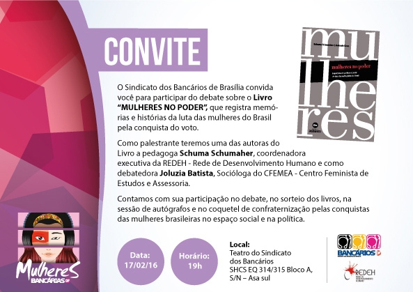 Memórias e histórias da luta das mulheres do Brasil pela conquista do voto fazem parte do livro “Mulheres no Poder: trajetória na política a partir da luta das sufragistas”, de autoria das pedagogas Antonia Ceva e Schuma Schumaher, sobre o qual haverá debate no dia 17 de fevereiro, às 19h, no Sindicato dos Bancários de Brasília (314/315 Sul – Bloco A).