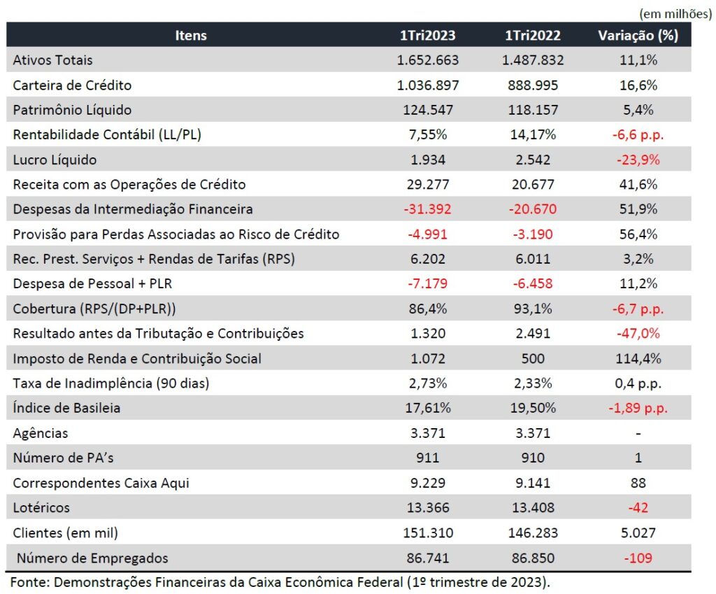 O Lucro Líquido da Caixa Econômica Federal foi de R$ 1,9 bilhão no 1º trimestre de 2023, com decréscimo de 23,9% em relação ao 1º trimestre de 2022 e de 11,1% em relação ao trimestre imediatamente anterior. A rentabilidade do banco sobre seu patrimônio líquido (ROE) ficou em 7,55%. Nos três primeiros meses do ano, a margem financeira Caixa cresceu 30,4%, em comparação ao mesmo período de 2022, atingindo R$ 13,9 bilhões. Por outro lado, houve elevação de 56,4% nas despesas de provisão para devedores duvidosos (PDD) e de 19,8% nas outras despesas administrativas.
